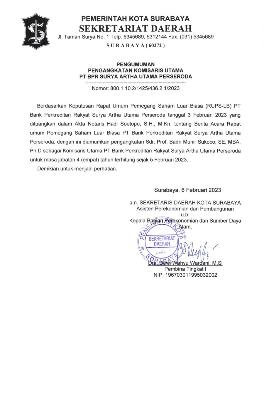 Pengangkatan Komisaris Utama PT BPR Surya Artha Utama Perseroda